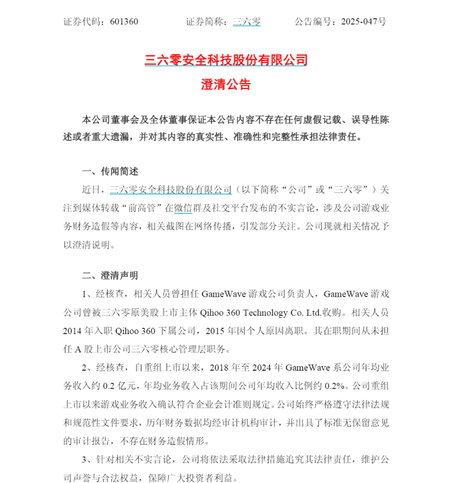 21财经《辟谣财知道》注意到,12月16日晚,三六零(601360.SH)发布澄清公告,近日,三六零关注到媒体转载“前高管”在微信群及社交平台发布的不实言论,涉及公司游戏业务财务造假等内容,相关截图在网络传播,引发部分关注。公司现就相关情况予以澄清说明。