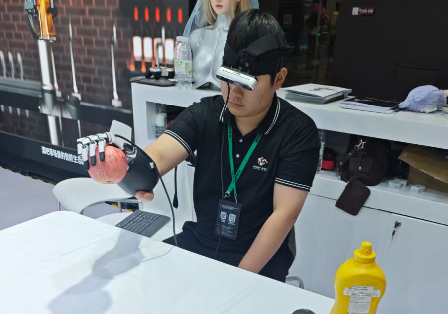 此外,细分民生场景的创新突破,为产业发展注入更多温度。深圳美丽魔方集团在嘉年华上带来了具身人形、陪伴助残以及理疗康复等多领域的产品。带有机械手臂的助残轮椅,到具备超声功能的机器人,以独特的技术逻辑刷新了康复辅助领域的想象。现场工作人员更是展示了通过头戴摄像头设备,无需手部操作,假肢即可稳稳握住苹果,全靠算法实时捕捉动作意图,自动判断并完成“举起”或“放下”的操作,目前产品虽仍处于测试阶段,但已展现出强大的实用潜力。