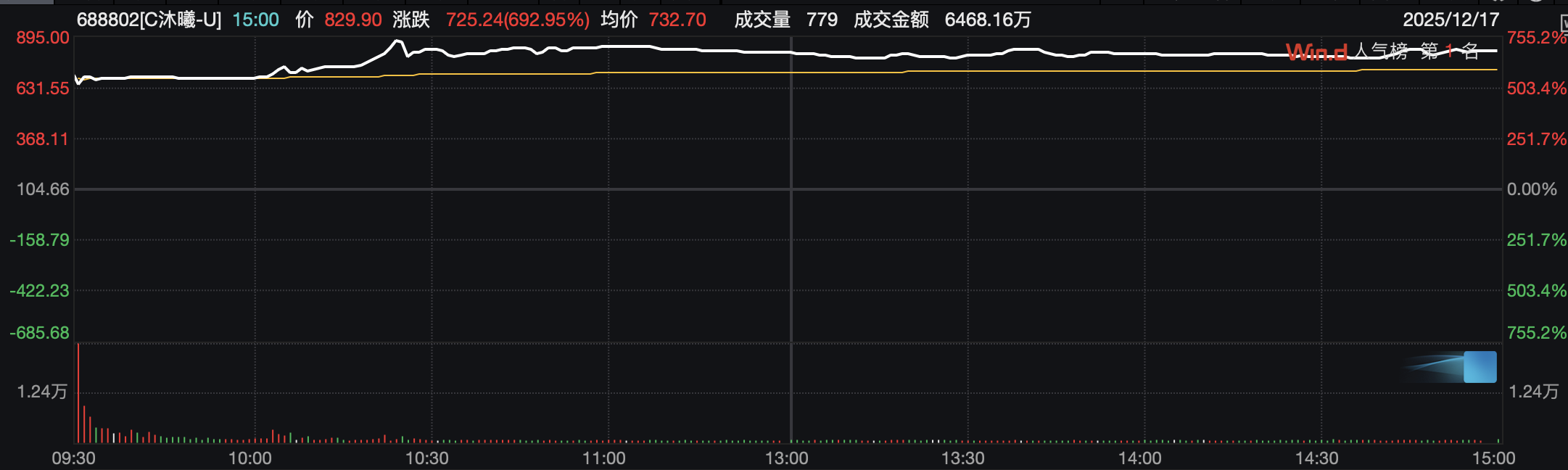 12月17日,国内GPU头部公司沐曦股份正式登陆资本市场,截至当日收盘,实现692.95%单日涨幅,以829.9元/股报收,总市值3320.43亿元。