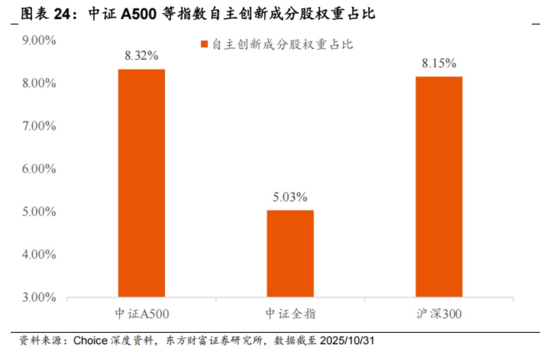 A500ETF南方紧密跟踪的中证A500指数。据了解,中证A500指数不仅覆盖广、权重散、行业风格均衡,并体现新质生产力特征,其在电子、电力设备、医药、国防军工等新兴产业相较沪深300指数显著超配,在金融、主要消费等传统行业权重占比显著降低,能够更集中地反映经济增长新动能的发展态势。为了应对全球竞争带来的挑战,中证A500深度参与到国家科技自立自强进程中,指数自主可控成分股占比权重约8.32%,远高于中证全指的5.03%。
