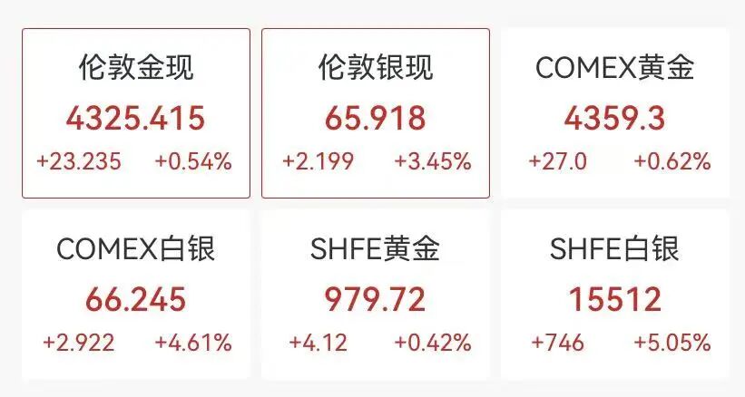 国际贵金属全线飘红,白银涨势最为强劲,截至发稿,现货白银在66美元/盎司附近震荡,COMEX白银大涨近5%,均刷新高,年初以来涨幅均超过125%。(详情)