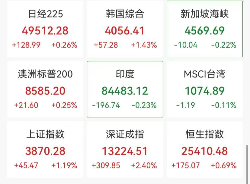 12月17日,亚太主要股指多数上涨,日经225指数小幅收红,韩国综合指数涨超1%;A股、港股表现强劲,富时中国A50快速拉升;国际贵金属全线飘红,白银再创新高;国内贵金属期货持续走高,铂、钯主力合约涨停。