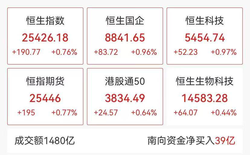 港股方面表现同样亮眼,恒生指数、恒生国企指数、恒生科技指数齐涨。