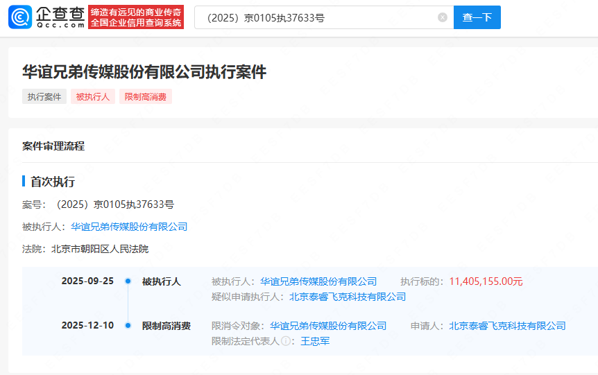 企查查APP显示,近日,华谊兄弟(300027.SZ)及其法定代表人王忠军因广告合同纠纷一案被限制高消费,申请人为北京泰睿飞克科技有限公司。此前,该公司因此案已被执行1140余万。
