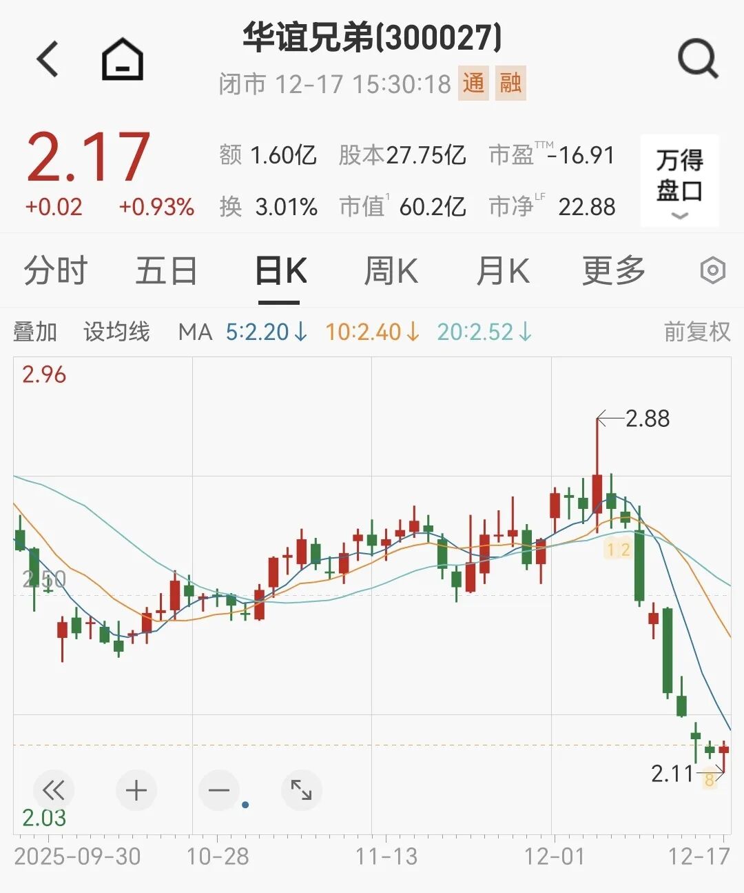 截至2025年12月17日收盘,华谊兄弟每股报收2.17元,公司总市值约60.21亿元。