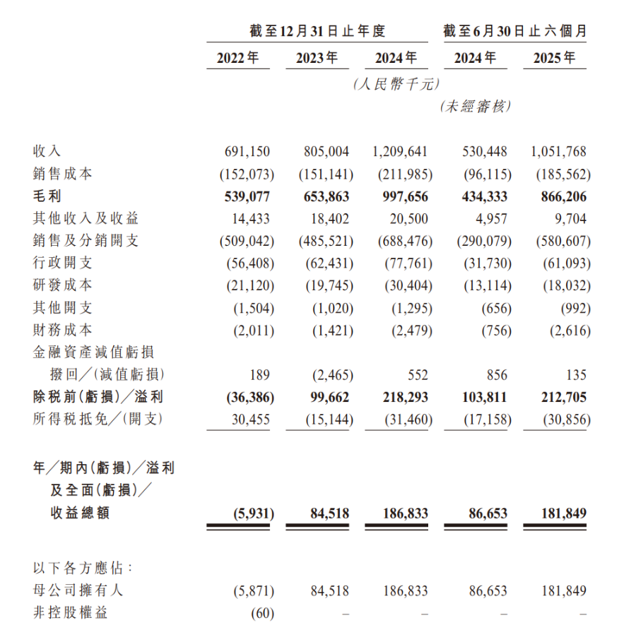 近年来,林清轩的业绩增长迅猛,收入从2022年的6.91亿元增长至2023年的8.05亿元与2024年的12.10亿元,年复合增长率达32.3%;同时,公司扭亏为盈,净利润从2022年亏损593万元转为2023年盈利845万元,2024年盈利进一步增长121.1%至1.87亿元。