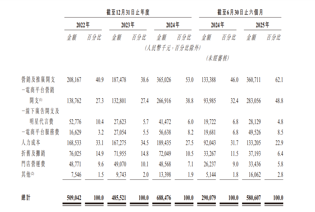 2025 年上半年,林清轩销售及分销开支达5.81亿元,占当期总营收的55.2%。