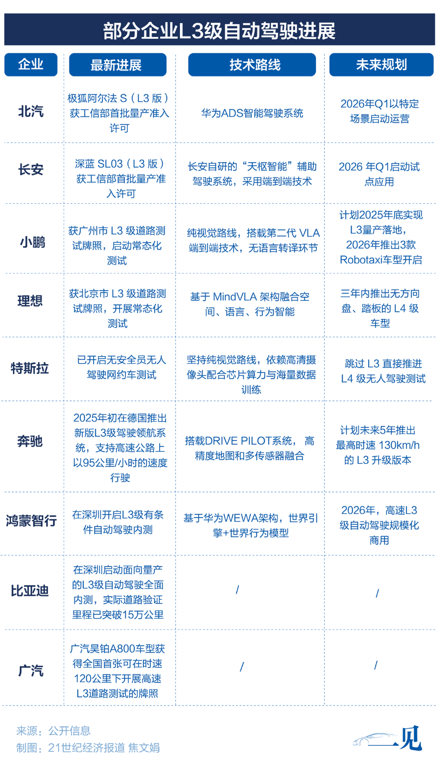 “L3是手段,不是目的。它让车企能够第一次合法地在公开道路上,以‘准入产品’而非‘测试车辆’的身份,去跑通高阶自动驾驶的完整运营流程。”一位自动驾驶的从业人员向21世纪经济报道记者分析,“你需要先证明,在有安全员兜底的情况下,你的整套系统能安全、稳定地运营,然后才有资格谈下一步。”