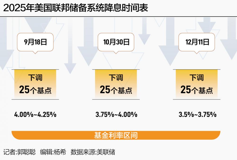 9月18日,美联储首次启动降息,将联邦基金利率区间下调25个基点至4.00%~4.25%;10月30日进行第二次降息,利率区间进一步调降至3.75%~4.00%;12月11日的第三次降息后,利率最终落在了3.50%~3.75%区间,业内人士表示,全年宽松力度与市场此前预判一致。