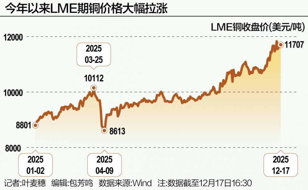 伦敦金属交易所(LME)三个月期铜的走势可谓芝麻开花节节高,12月12日盘中一度触及11952美元/吨的历史新高。此后,铜价高位震荡,截至12月17日19时LME铜价达到11727美元/吨。与此同时,沪铜主连当日上涨0.4%,收报92820元/吨。