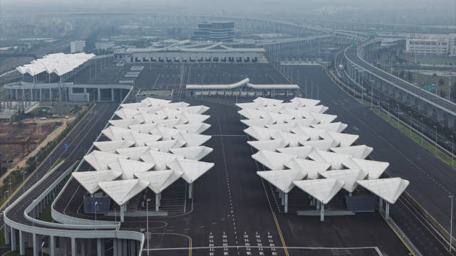 位于新海港和南港“二线口岸”(货运)集中查验场的离岛货车通关服务中心入口处。图源新华社
