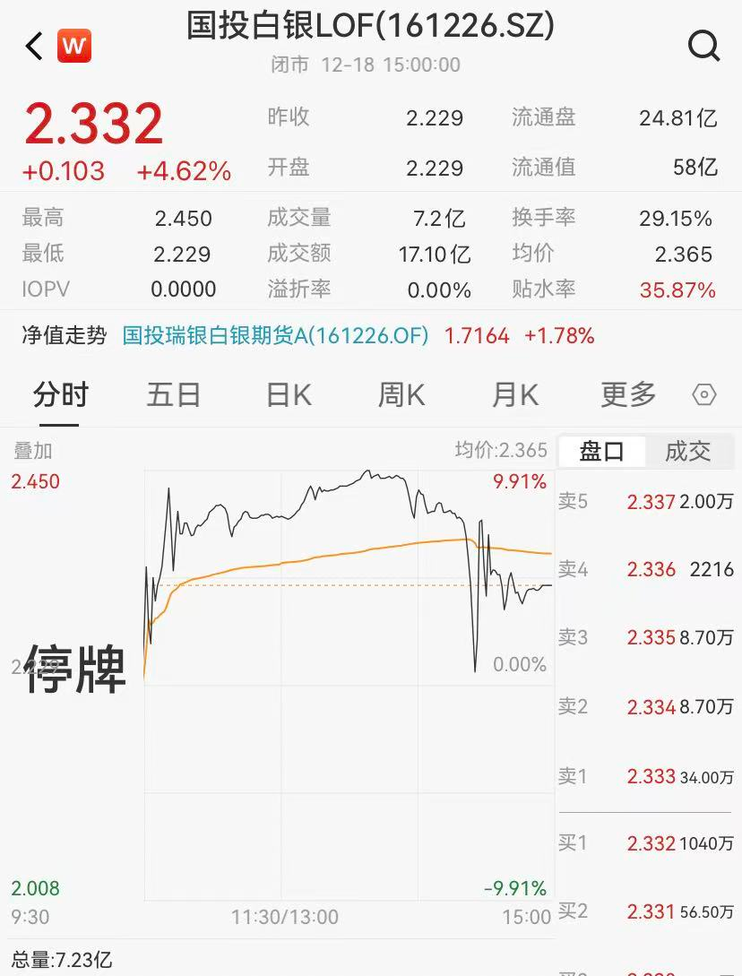 消息面上,12月18日,在临时停牌1小时后,国投白银LOF二级市场价格持续狂飙,下午一度接近10%涨停,其二级市场价格相比昨日的基金份额净值溢价幅度超过了40%。