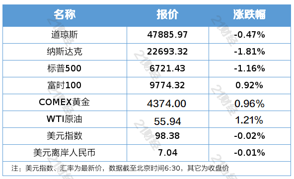 1、美国三大股指全线收跌,道指跌0.47%报47885.97点,标普500指数跌1.16%报6721.43点,纳指跌1.81%报22693.32点。卡特彼勒跌超4%,英伟达跌近4%,领跌道指。万得美国科技七巨头指数跌2.03%,特斯拉跌超4%,谷歌跌逾3%。中概股多数下跌,世纪互联、蔚来跌超3%。AI相关个股普遍承压。投资者正在权衡最新公布的美国经济报告。美联储主席热门候选人沃勒表示支持进一步降息。
