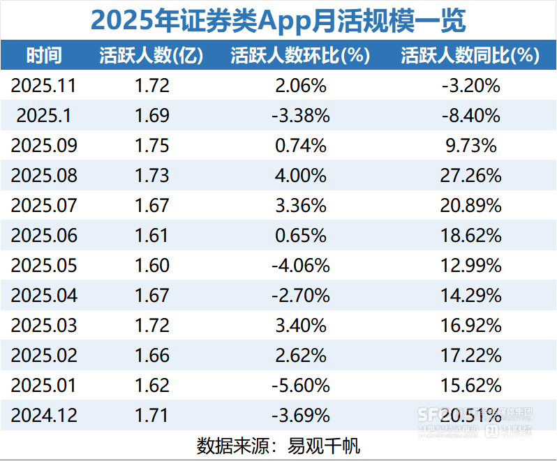 易观千帆最新数据显示,2025年11月证券类App的月活跃用户总数约1.72亿人,环比增长2.06%,同比减少3.20%。