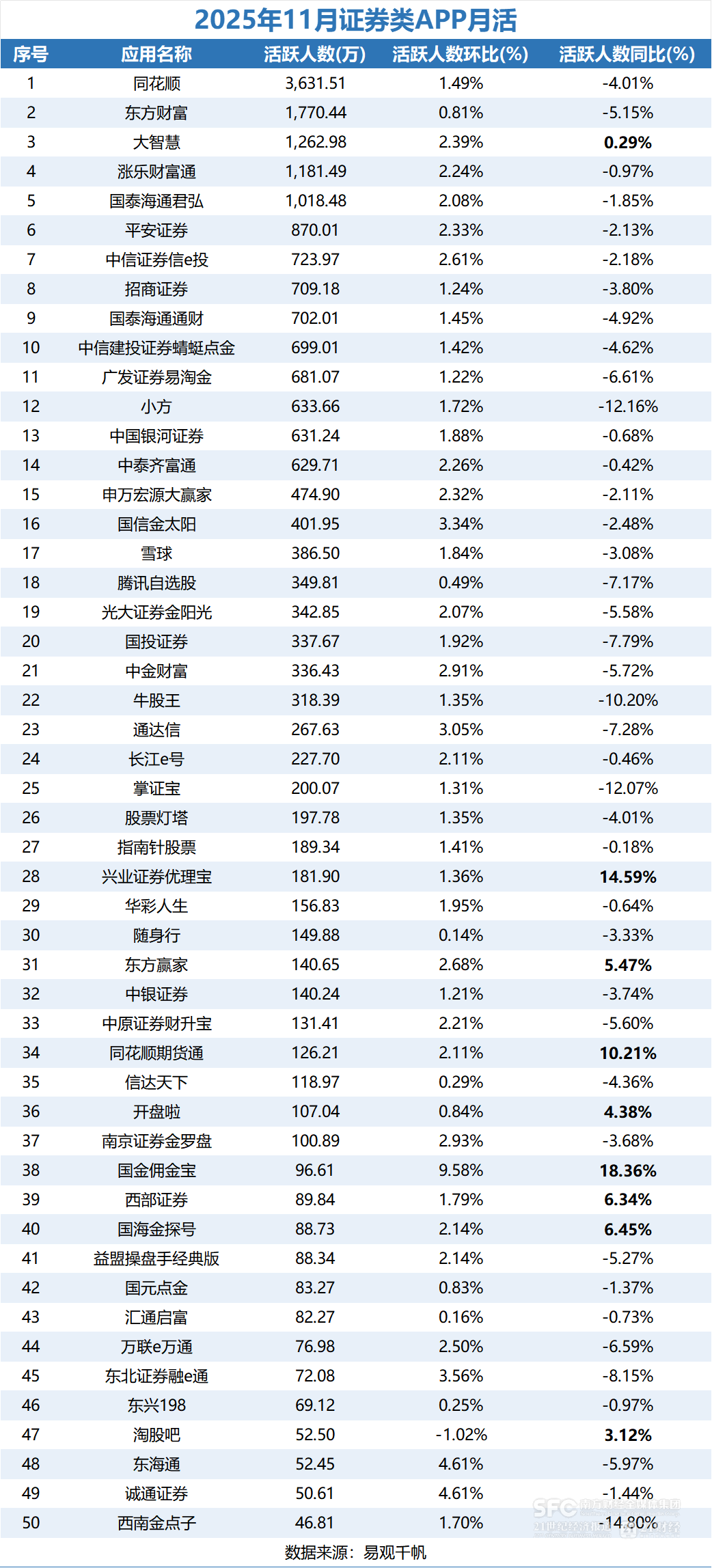 在此背景下,11月的市场情绪波动与投资者入市节奏变化,同样反映在证券类App用户活跃度上,整体呈现环比增长、同比下降的分化态势。