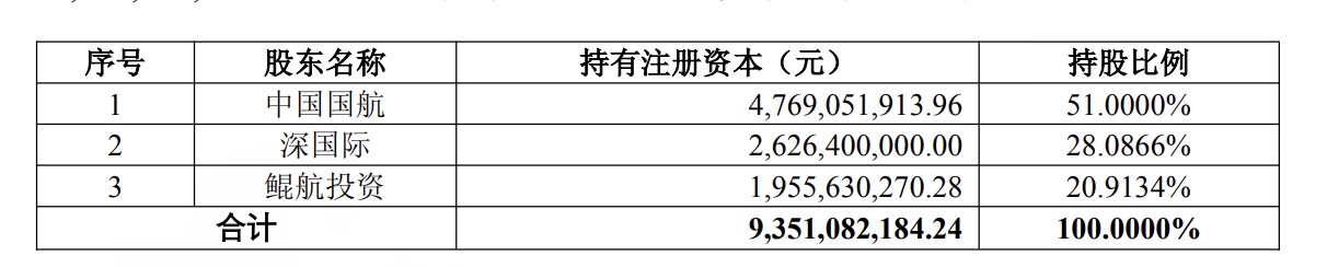 根据协议,鲲航投资以20亿元向深圳航空增资,认购深圳航空新增注册资本19.56亿元,持有增资后深圳航空20.91%股权。作为控股方,中国国航也将以非公开方式同步参与,以20.82亿元向深圳航空增资,认购深圳航空新增注册资本20.35亿元,增资后的中国国航对深圳航空持股比例维持51%,仍将维持控股地位。原有股东方深国际持股比例将从原来的49%降至28.09%。