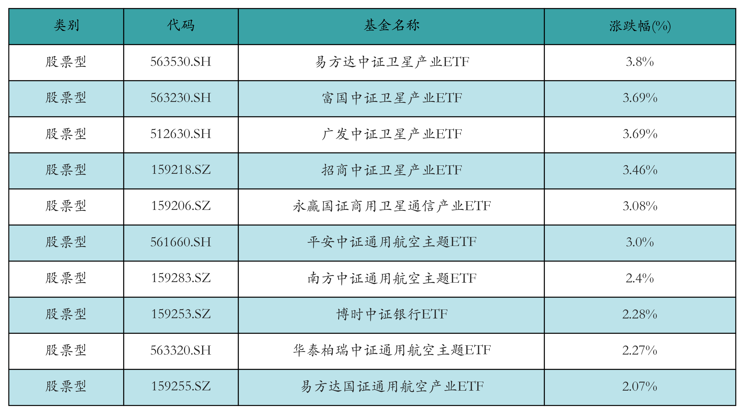 昨日股票型ETF涨幅最高的3只ETF及其收益率分别为:易方达中证卫星产业ETF(3.8%)、富国中证卫星产业ETF(3.69%)、广发中证卫星产业ETF(3.69%)。涨幅前10详情见下表: