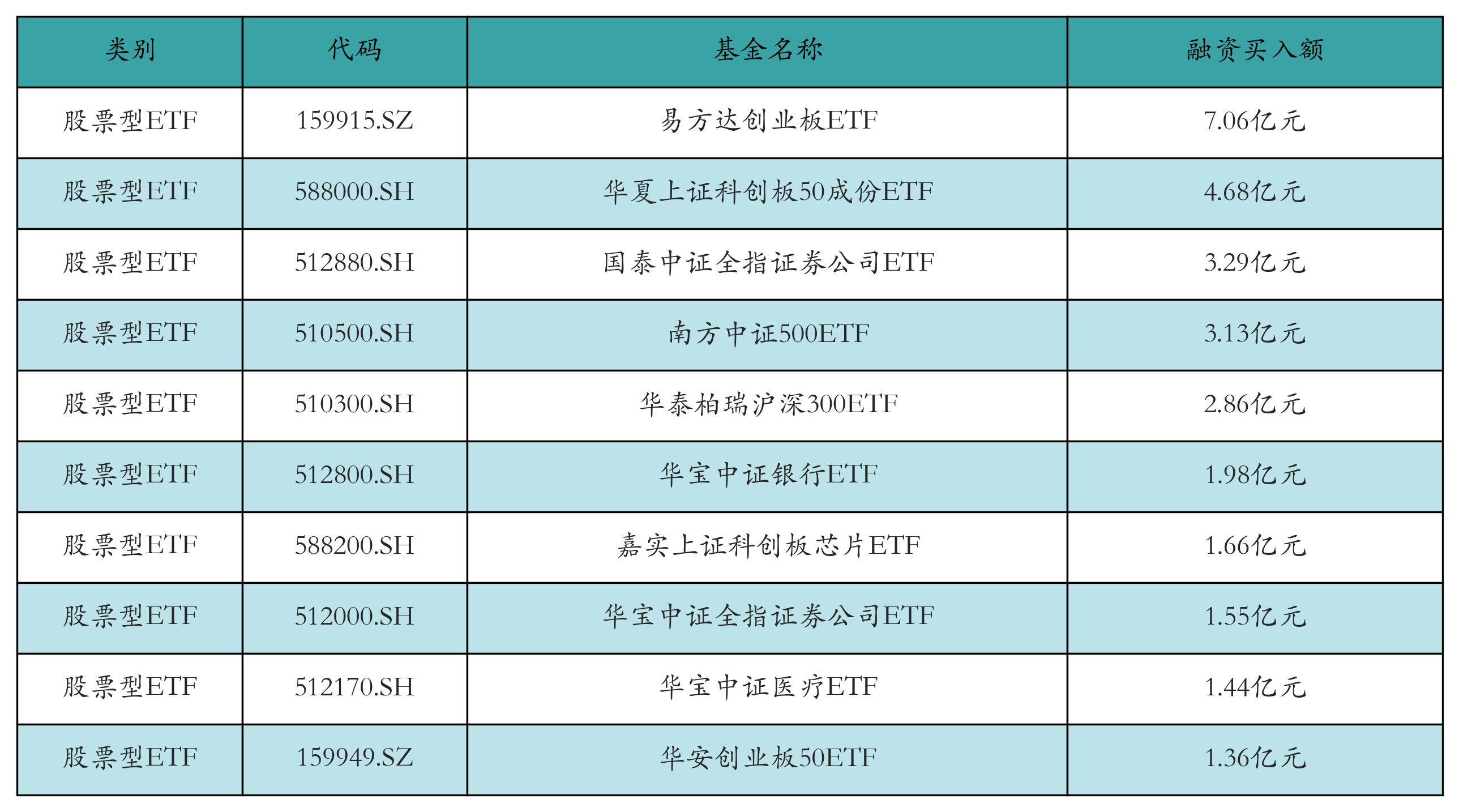 昨日股票型ETF融资买入额最高的3只ETF及其买入金额分别为:易方达创业板ETF(7.06亿元)、华夏上证科创板50成份ETF(4.68亿元)、国泰中证全指证券公司ETF(3.29亿元)。融资买入额前10详情见下表: