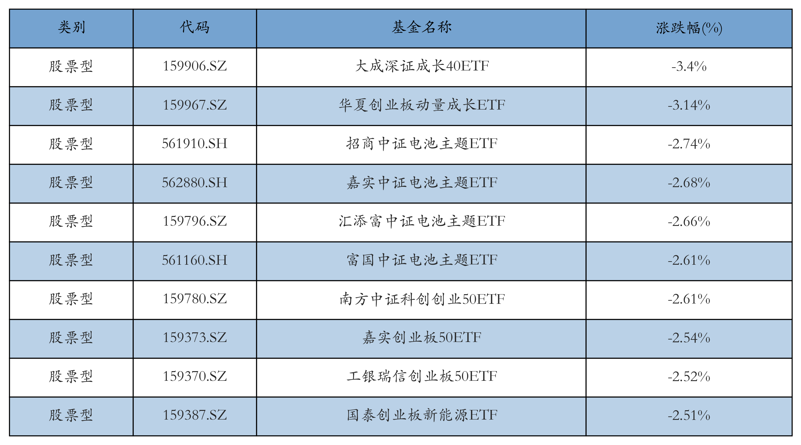 昨日股票型ETF跌幅最大的3只ETF及其收益率分别为:大成深证成长40ETF(-3.4%)、华夏创业板动量成长ETF(-3.14%)、招商中证电池主题ETF(-2.74%)。跌幅前10详情见下表: