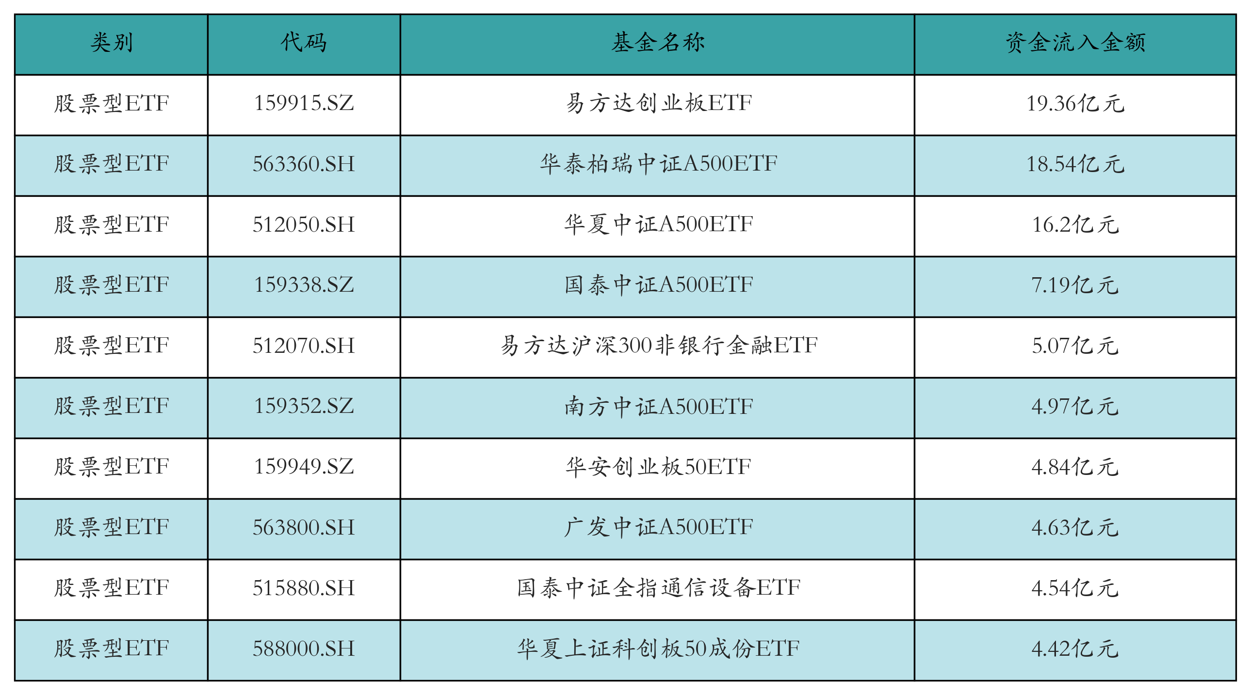 昨日股票型ETF资金流入最多的3只ETF及其流入金额分别为:易方达创业板ETF(流入19.36亿元)、华泰柏瑞中证A500ETF(流入18.54亿元)、华夏中证A500ETF(流入16.2亿元)。资金流入前10详情见下表: