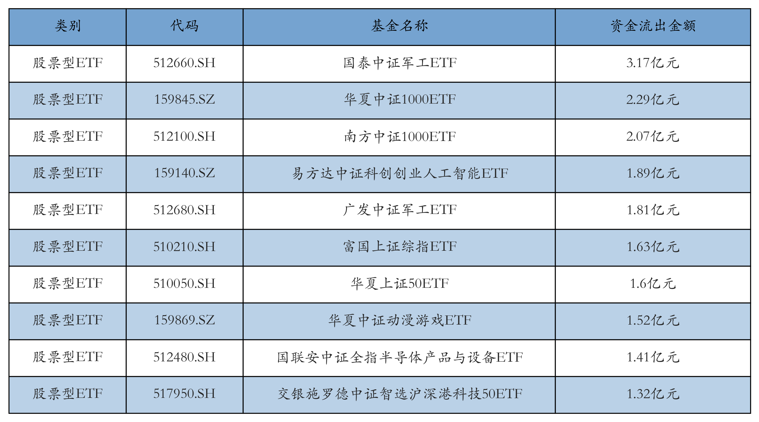 昨日股票型ETF资金流出最多的3只ETF及其流出金额分别为:国泰中证军工ETF(流出3.17亿元)、华夏中证1000ETF(流出2.29亿元)、南方中证1000ETF(流出2.07亿元)。资金流出前10详情见下表: