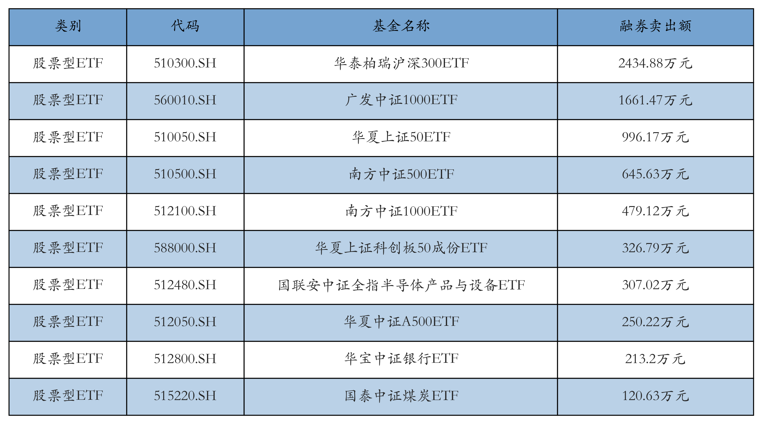 昨日股票型ETF融资卖出额最高的3只ETF及其卖出金额分别为:华泰柏瑞沪深300ETF(2434.88万元)、广发中证1000ETF(1661.47万元)、华夏上证50ETF(996.17万元)。融券卖出额前10详情见下表: