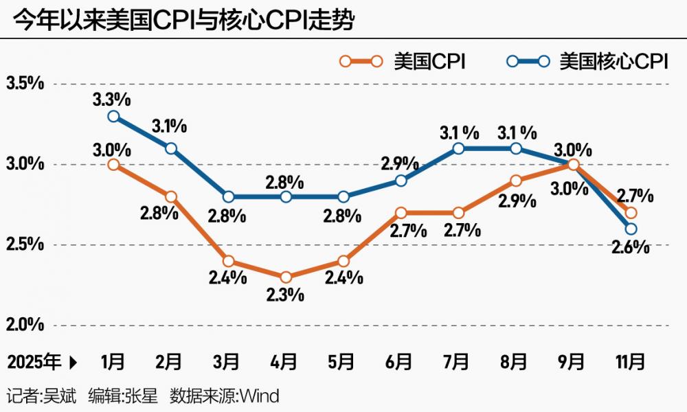 不过,整体而言,这份意外的通胀数据参考价值有限。东吴证券首席经济学家芦哲对21世纪经济报道记者分析称,11月CPI和核心CPI均大幅低于预期。美国11月CPI在技术层面面临两个问题:首先,因为政府停摆,10月数据未采集,因此没有10月CPI数据,11月CPI只有同比数据,没有环比数据。其次,由于政府停摆11月14日才结束,数据收集工作滞后,部分价格调查、样本采集和行政数据输入在时间上存在滞后或集中补报,一些服务类、政府相关支出和监管价格的更新可能被推迟或以估算值替代。例如,10—11月居住CPI环比均值接近0%,而前几个月环比增速在0.2%—0.3%,出现明显的误差,表明在部分数据缺失的情况下,劳工部在技术处理上的问题令数据存在失真。