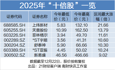 据21财经·南财快讯统计,2025年A股市场“十倍股”频现,上纬新材、天普股份等多只个股涨幅超10倍。