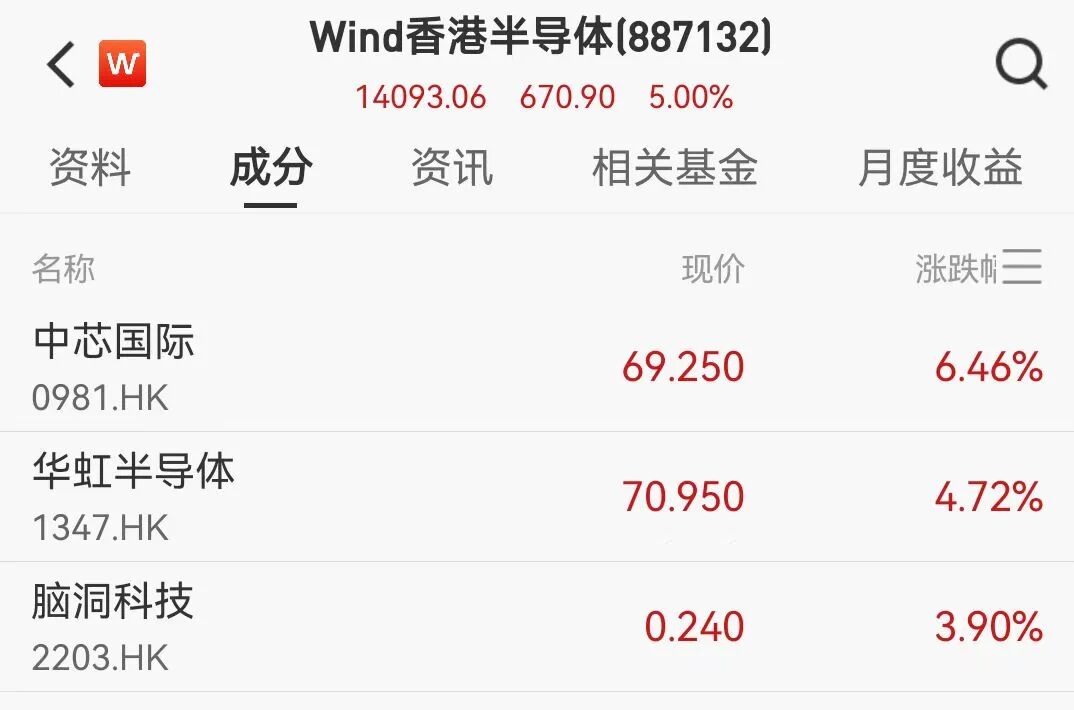 港股半导体个股大幅走强,截至发稿,中芯国际涨幅超6%,华虹半导体涨幅超4%。