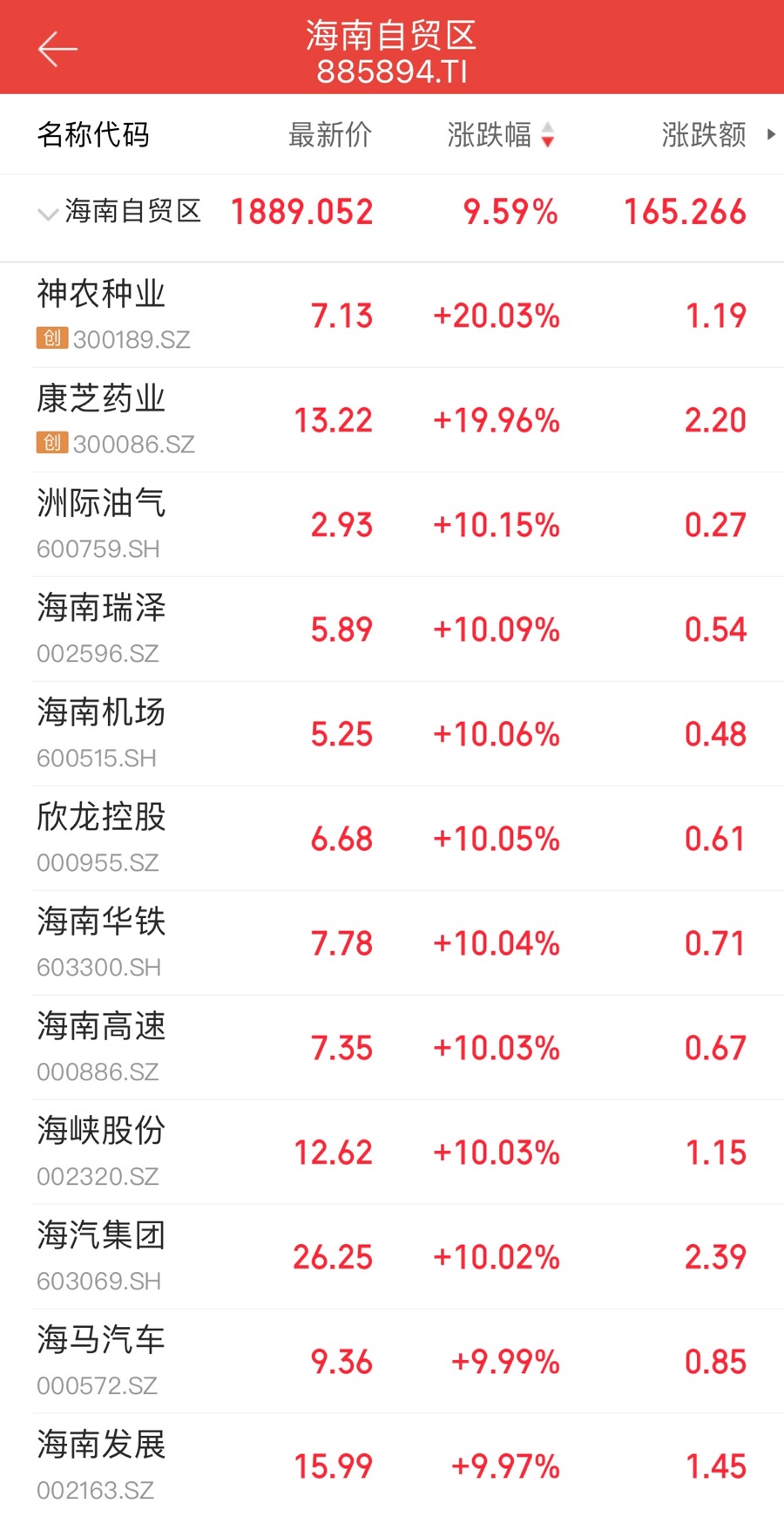 12月22日,A股市场“海南板块”再度成为最亮眼的风景线。截至午盘,神农种业与康芝药业均20CM涨停,海南瑞泽、海南机场、海南高速、海南发展等23只个股相继封板,板块内掀起涨停潮。
