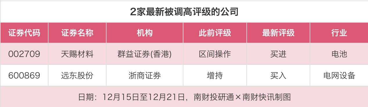 评级调高方面,12月15日至12月21日,券商调高上市公司评级达到2家次,最新数据包括了群益证券(香港)对天赐材料的评级从“区间操作”调高至“买进”,浙商证券对远东股份的评级从“增持”调高至“买入”。