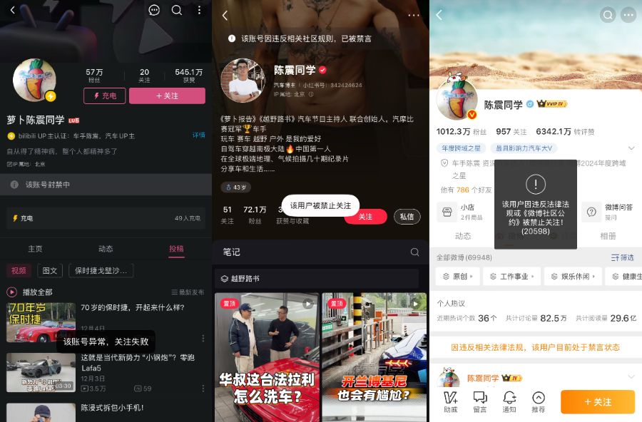 21财经·南财快讯记者实测发现,截至发稿,陈震的小红书、B站和微博账号均显示封禁状态,且无法被关注。