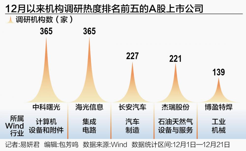 Wind数据显示,12月1日—12月21日,中科曙光、海光信息、长安汽车、杰瑞股份、博盈特焊至少获得了365家、365家、227家、221家、139家机构调研,为机构调研热度排名前五的上市公司。