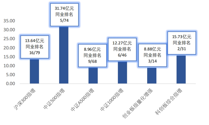 单只产品管理规模方面,天弘基金旗下多只指数增强基金在同业中占据领先地位。截至2025年三季度末,天弘上证科创板综合指数增强管理规模达15.73亿元,在31只科创综指增基金中排名第2;天弘创业板指数量化增强管理规模为 8.88 亿元,在14 只同类基金中排名第3。此外,天弘中证500指数增强、天弘中证A500指数增强以及天弘中证1000指数增强的管理规模也均稳居同业前10,呈现出该公司在各主流赛道的全面竞争力。