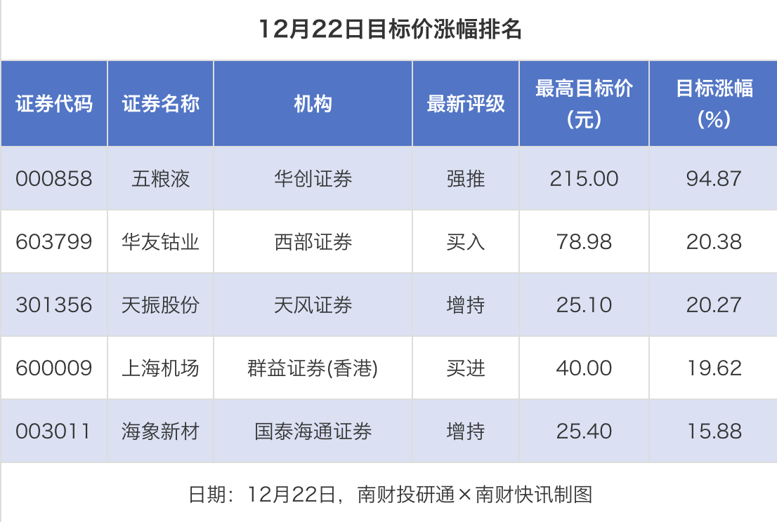 南财投研通数据显示,12月22日,券商给予上市公司目标价共5次,按最新收盘价计算,目标价涨幅排名居前的公司有五粮液、华友钴业、天振股份,目标价涨幅分别为94.87%、20.38%、20.27%,分别属于白酒、能源金属、家居用品行业。