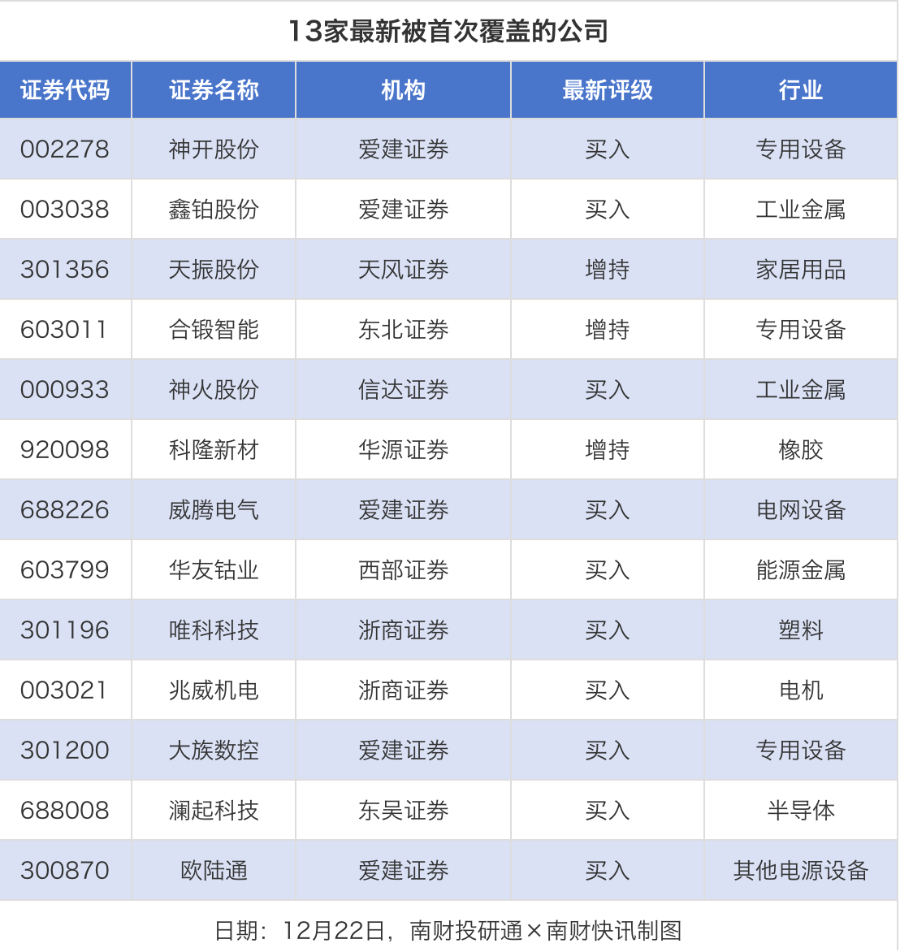首次覆盖方面,12月22日券商共给出了13次首次覆盖,其中神开股份、鑫铂股份获得爱建证券分别给予“买入”评级,天振股份获得天风证券给予“增持”评级,合锻智能获得东北证券给予“增持”评级,神火股份获得信达证券给予“买入”评级。