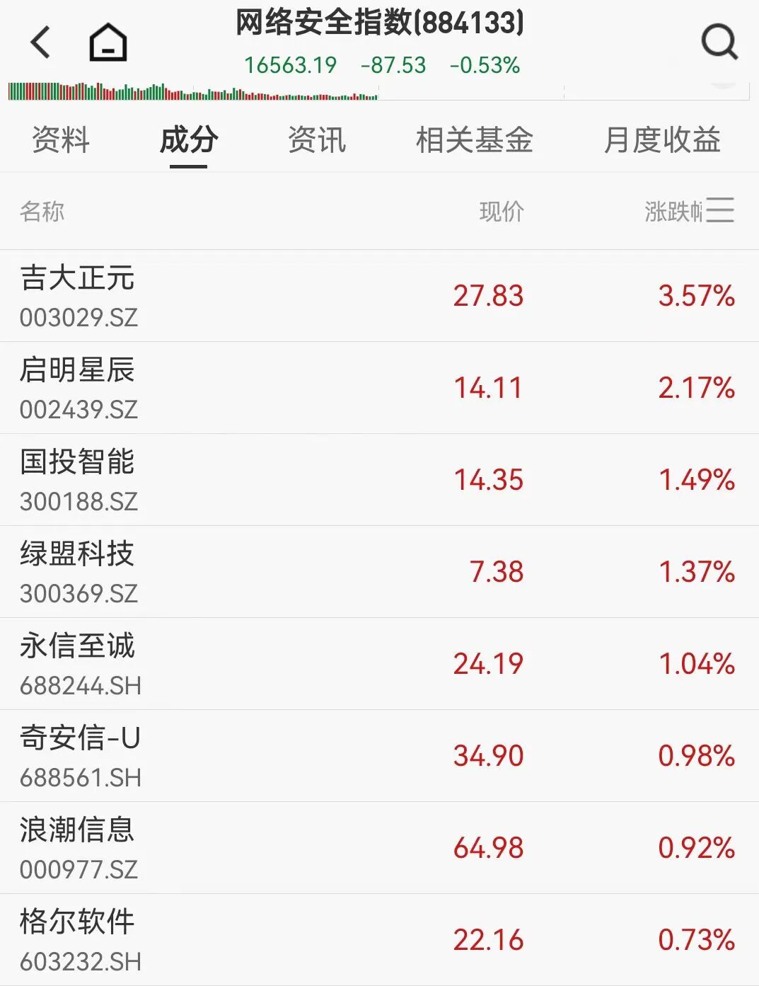 12月23日,A股网络安全板块迎来异动,板块多股高开。截至午盘有所回落,吉大正元涨超3%,启明星辰涨超2%,永信至诚涨超1%,奇安信、绿盟科技、亚信安全、盛邦安全等跟涨。