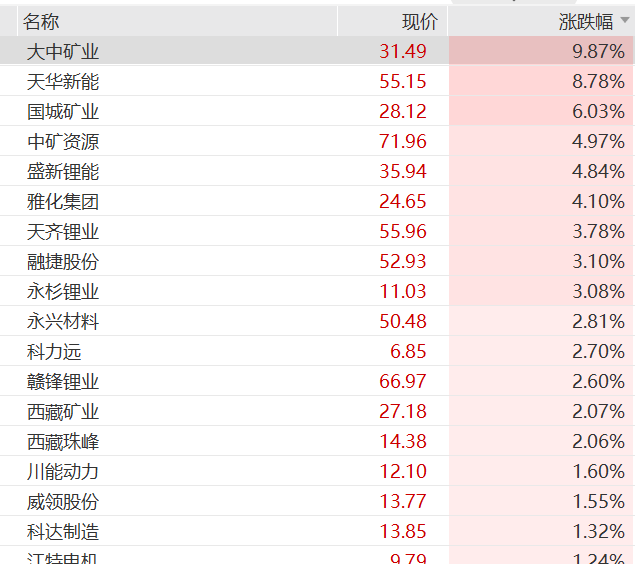 锂矿指数强势拉升,大中矿业涨近10%,天华新能涨超8%,中矿资源上涨6%,盛新锂能、融捷股份等多股跟涨。