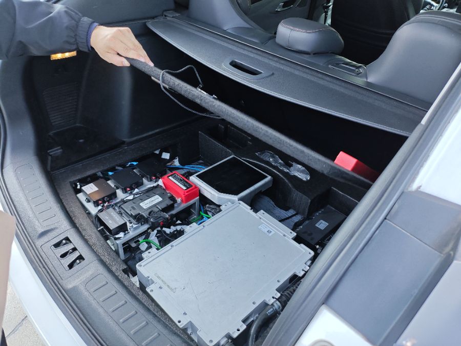 平台另一区域,如祺出行Robotaxi运营负责人邹昶打开了无人驾驶出租车的后备箱,精密的主机仪器整齐摆放在隔板下方。