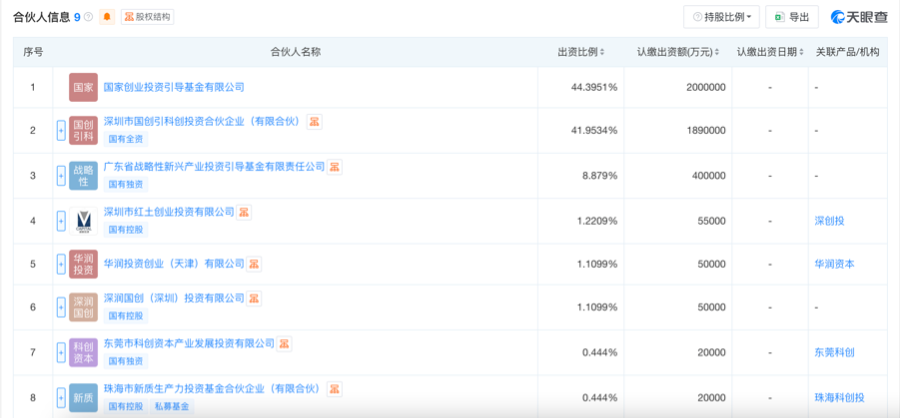 其入股的粤港澳大湾区创投引导基金,是被誉为“创投国家队”的国家创业投资引导基金于12月22日同日在北京、上海、深圳三地设立的三只区域子基金之一,注册资本450.5亿元,由国家创业投资引导基金有限公司(出资200亿元)、深圳市国创引科创投资合伙企业(有限合伙)(出资189亿元)、广东战略性新兴产业基金(出资40亿元)以及江门市、东莞市、珠海市相关国资主体/基金等共同出资组建,执行事务合伙人为深润国创(深圳)投资有限公司。