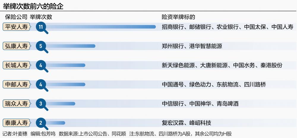 例如,弘康人寿今年6月27日首次举牌郑州银行H股,并在此后进行了16次增持,最新持股比例达22.14%,累计触发4次举牌。平安人寿也多次举牌同一家上市公司股票,年内其对招商银行H股、邮储银行H股、农业银行H股各举牌3次,目前,其对招商银行H股、邮储银行H股以及农业银行H股的最新持股比例分别为18.02%、16.01%以及18.14%。