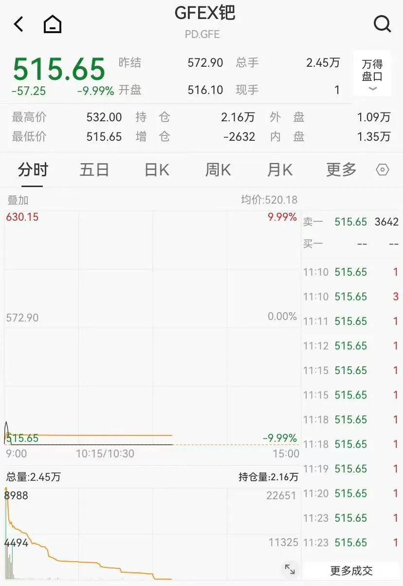 12月25日,广期所钯期货主力合约触及跌停板,日内跌9.99%,现报515.65元/克,为上市以来第一次跌停,本月曾五次触及涨停。