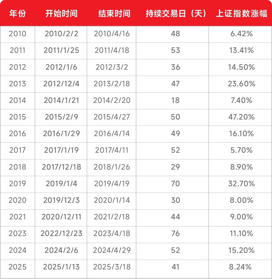 作为A股最为显著的“日历效应”之一,2010年以来,“春季行情”几乎每年都会出现(除2022年外),只是发生时间和上涨幅度各不相同。