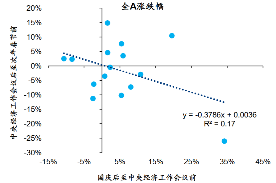 也就是说,如果“国庆后至中央经济工作会议前”A股表现一般,那么当年的春季行情有望表现更好,行情更值得期待。