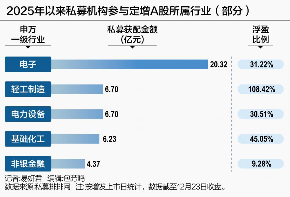 投资收益方面,若以2025年12月23日收盘价计算,今年内私募机构参与定增投资的整体浮盈金额达到27.24亿元,整体浮盈比例为45.55%。