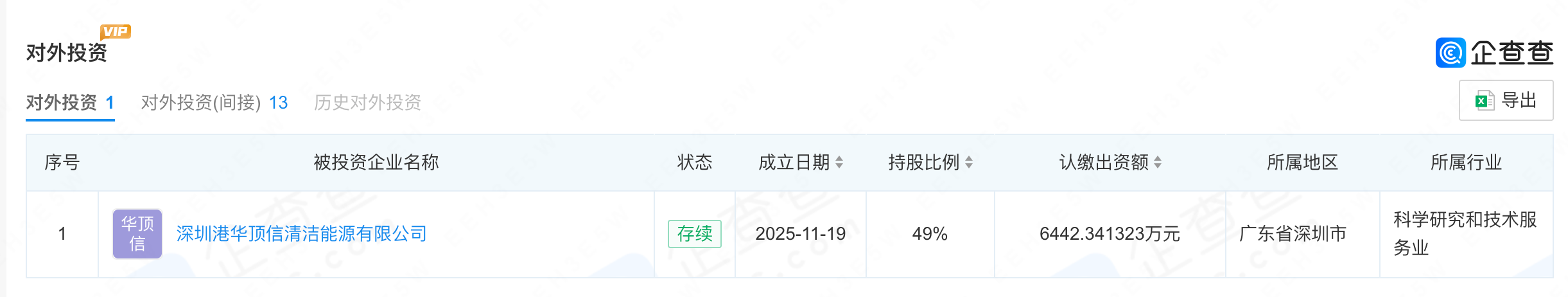 南方财经记者注意到,工商信息显示,12月24日信银金投完成了对深圳港华顶信清洁能源有限公司的投资,认缴出资额6442.34万元,持股比例49%,成为该公司的第二大股东。