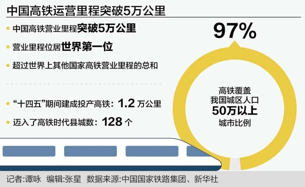 据国铁集团官方微信公号“中国铁路”发布,2025年12月26日,随着西安至延安高铁开通运营,中国高铁营业里程突破5万公里。目前,高铁覆盖了我国97%的城区人口50万以上城市,营业里程位居世界第1位。