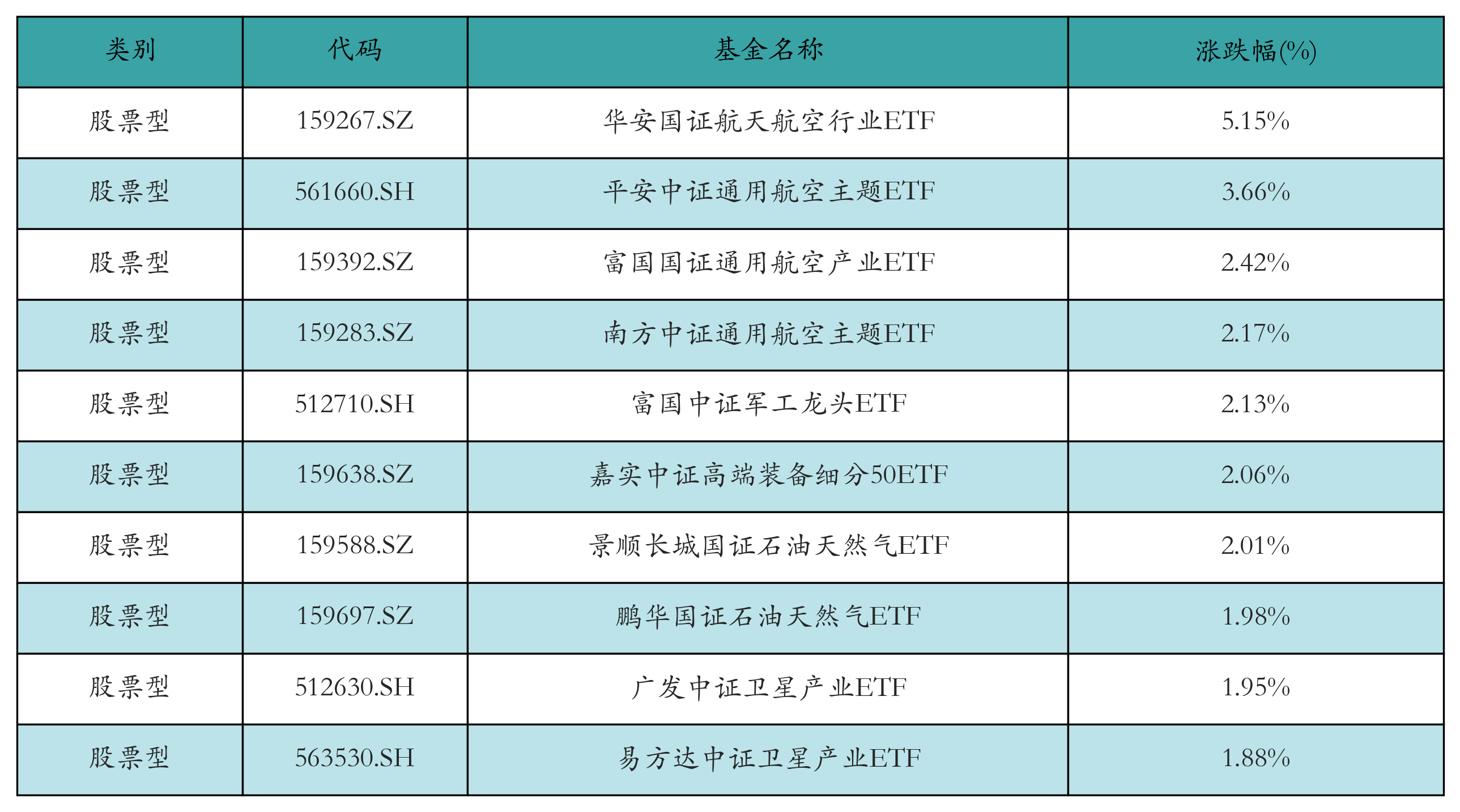 昨日股票型ETF涨幅最高的3只ETF及其收益率分别为:华安国证航天航空行业ETF(5.15%)、平安中证通用航空主题ETF(3.66%)、富国国证通用航空产业ETF(2.42%)。涨幅前10详情见下表: