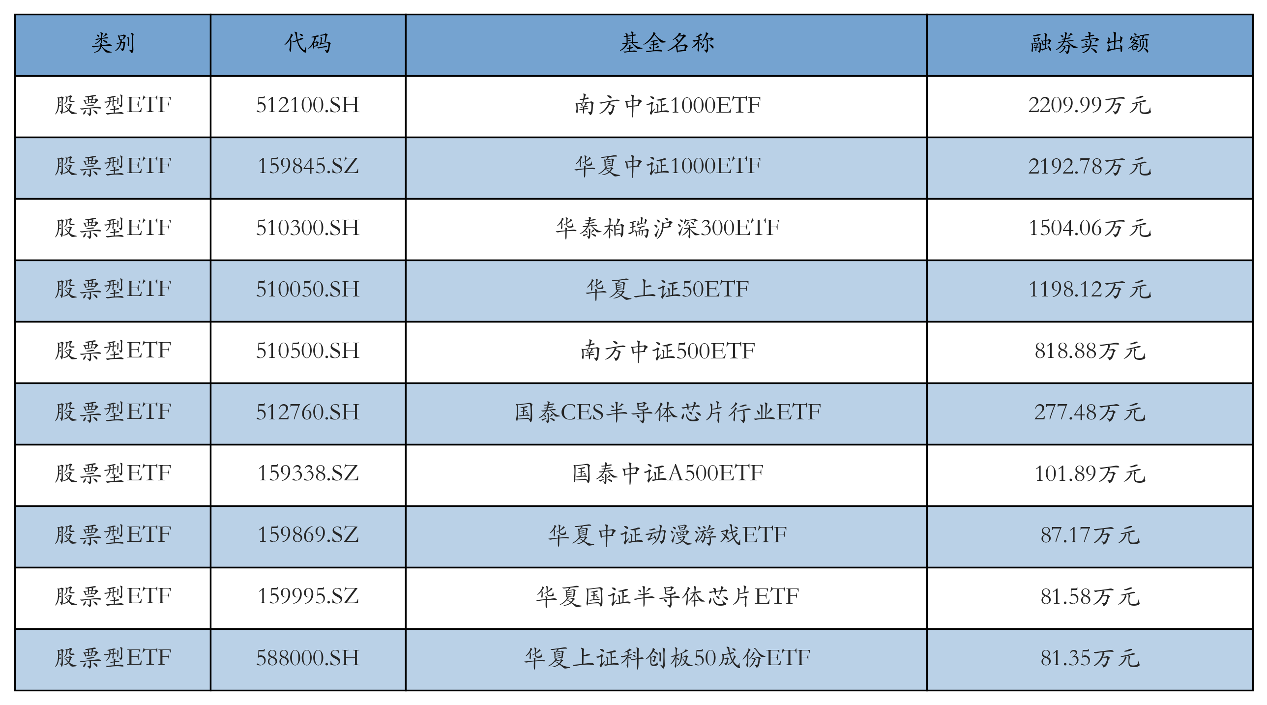 昨日股票型ETF融资卖出额最高的3只ETF及其卖出金额分别为:南方中证1000ETF(2209.99万元)、华夏中证1000ETF(2192.78万元)、华泰柏瑞沪深300ETF(1504.06万元)。融券卖出额前10详情见下表: