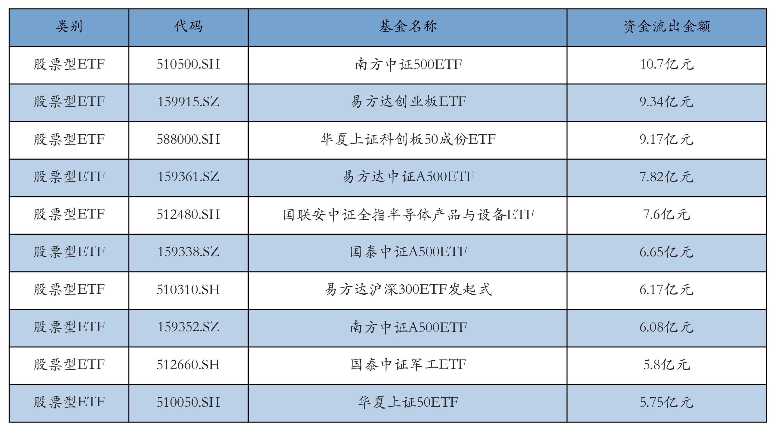 昨日股票型ETF资金流出最多的3只ETF及其流出金额分别为:南方中证500ETF(流出10.7亿元)、易方达创业板ETF(流出9.34亿元)、华夏上证科创板50成份ETF(流出9.17亿元)。资金流出前10详情见下表: